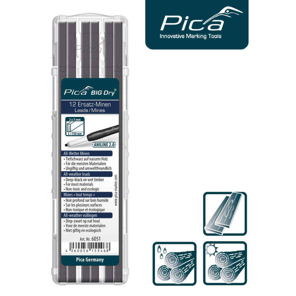 Набор сменных грифелей-стержней серого цвета от компании PICA (Германия) для строительных карандашей PICA BIG Dry Longlife Construction 6060. Исполнение 6051 Aniline 2.0 „All-Wetter-Minen“ - для работ в условиях повышенной влажности, подходит для большинства материалов, хорошее решение при проведении внешних строительных работ. Для глубокой черной маркировки на влажной древесине. Поставляются в удобной и прочной пластиковой коробке. Имеют прямоугольный профиль 2 x 5 мм и длину 150 мм. Каждый стержень хранится в отдельном отделении.
