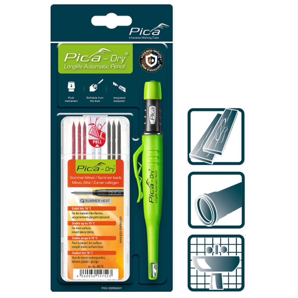 PICA Dry LongLife - идеальное решение для целого спектра строительных и плотницких задач, тонкий металлический носик позволяет наносить четкую линию и обеспечивает доступ к труднодоступным местам. Яркий ударопрочный корпус с запатентованной точилкой никогда не исчезнет из поля зрения. Герметичный внутренний механизм обеспечивает пыле- и водо-защиту грифелей-стержней.