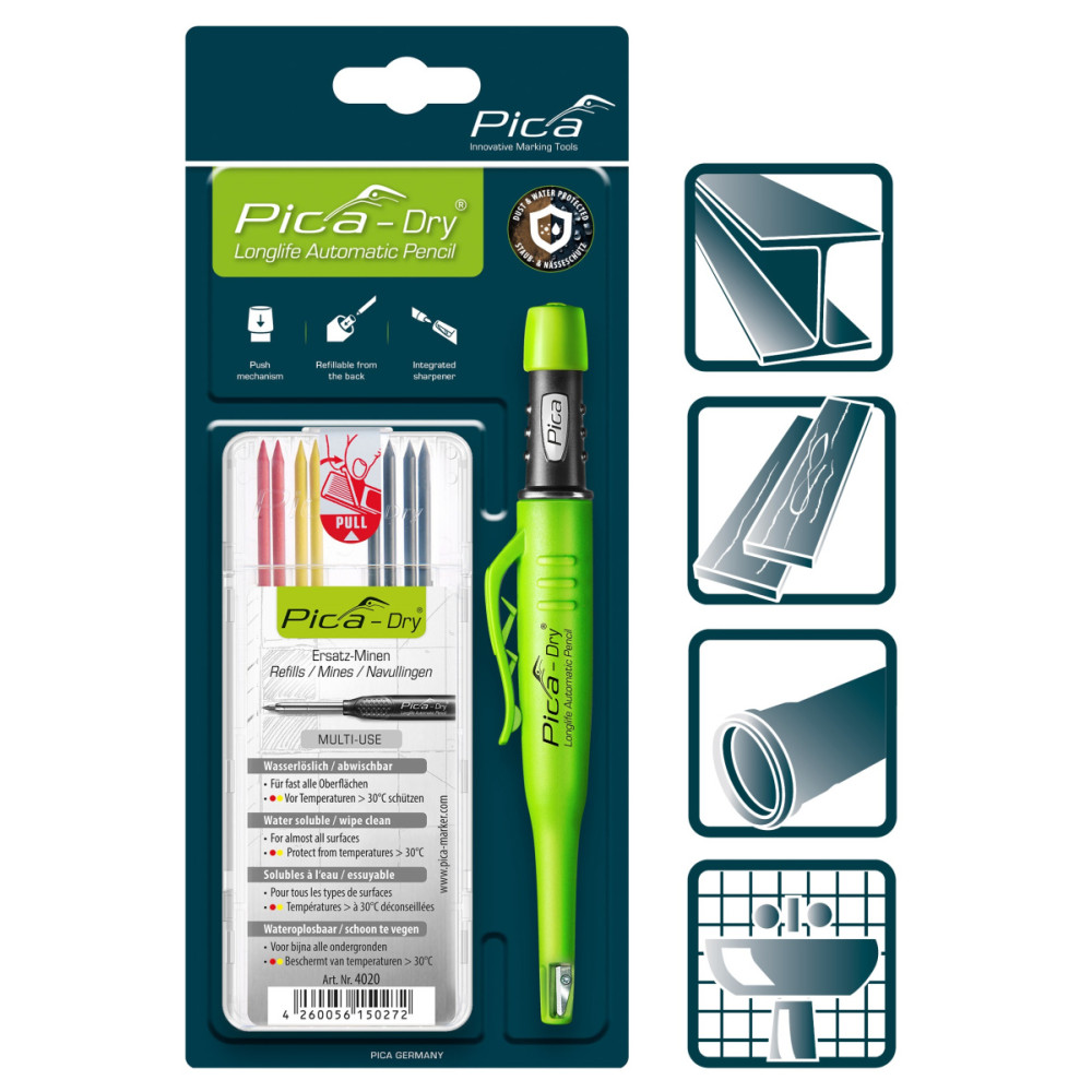 PICA Dry LongLife - идеальное решение для целого спектра строительных и плотницких задач, тонкий металлический носик позволяет наносить четкую линию и обеспечивает доступ к труднодоступным местам. Яркий ударопрочный корпус с запатентованной точилкой никогда не исчезнет из поля зрения. Герметичный внутренний механизм обеспечивает пыле- и водо-защиту грифелей-стержней.