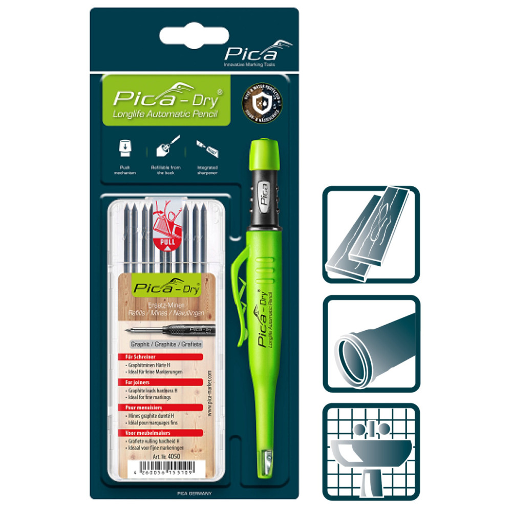 PICA Dry LongLife - идеальное решение для целого спектра строительных и плотницких задач, тонкий металлический носик позволяет наносить четкую линию и обеспечивает доступ к труднодоступным местам. Яркий ударопрочный корпус с запатентованной точилкой никогда не исчезнет из поля зрения. Герметичный внутренний механизм обеспечивает пыле- и водо-защиту грифелей-стержней.