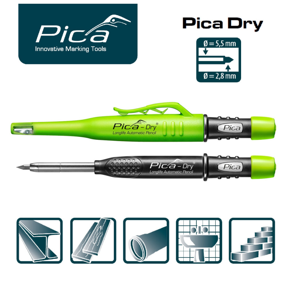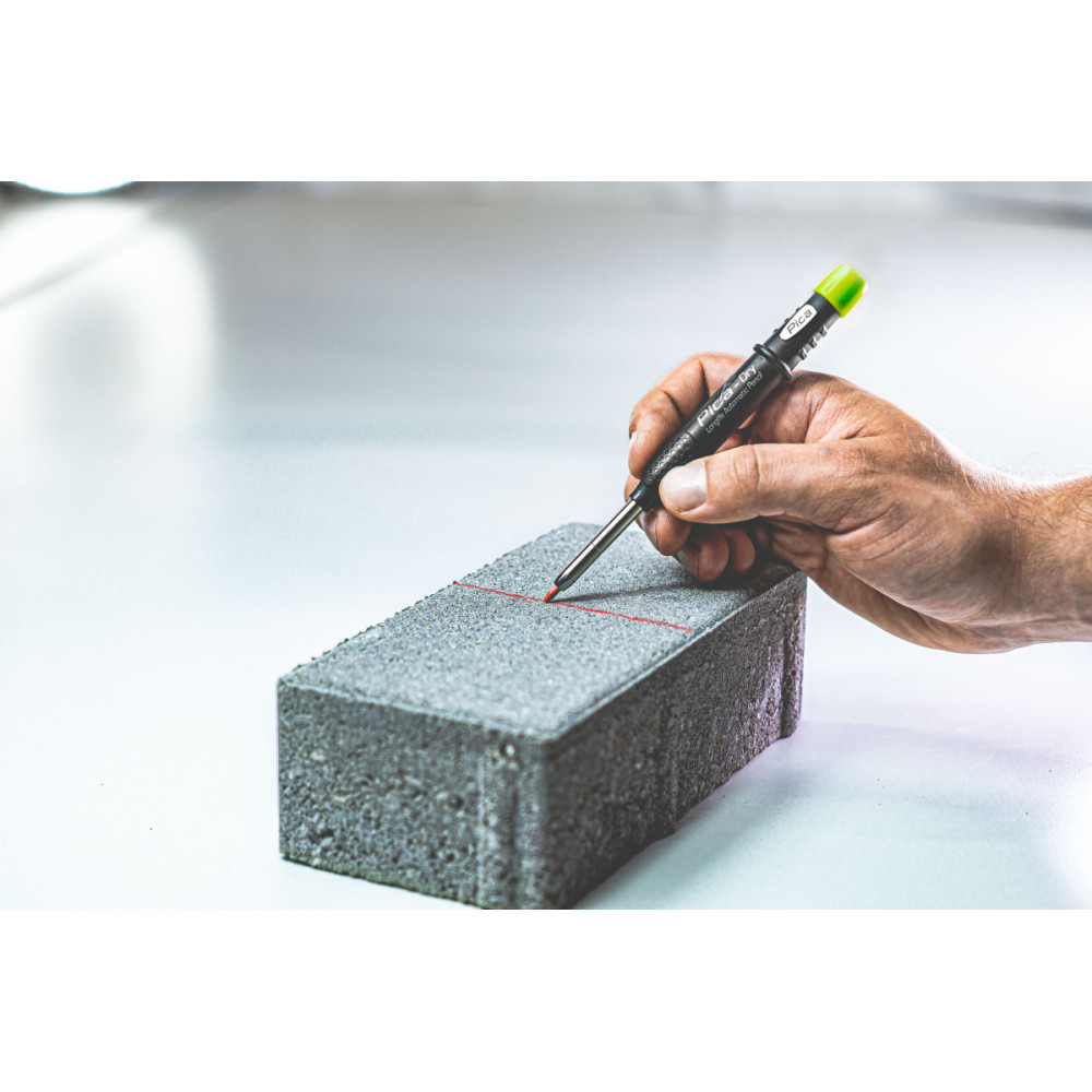 PICA Dry Long Life - идеальное решение для целого спектра строительных и плотницких задач, тонкий металлический носик позволяет наносить четкую линию и обеспечивает доступ к труднодоступным местам. Яркий ударопрочный корпус с запатентованной точилкой никогда не исчезнет из поля зрения. Герметичный внутренний механизм обеспечивает пыле- и водо-защиту грифелей-стержней.